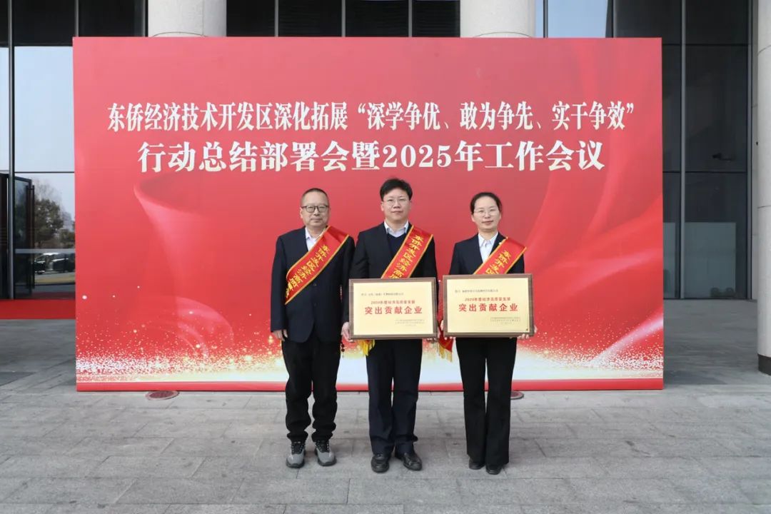 安发(福建)生物科技有限公司获评“东侨开发区2024年度经济高质量发展突出贡献企业”,郑春源总助(右二)作为公司代表领奖