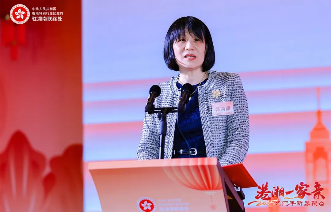 湖南省人民政府港澳事务办公室副主任郭向丽向出席嘉宾送上新春祝福并代表湖南省人民政府港澳事务办公室向香港各界的朋友致以热烈的欢迎,向长期以来关心和支持湖南发展的各界人士致以衷心的感谢。她表示,自改革开放以来,两地经济文化交流频繁,香港企业家在湖南投资兴业,湖南企业也通过香港资本市场发展壮大。近年来,两地贸易额显著增长,文化教育交流日益密切,香港青年在湖南学习红色精神,湖南学子通过游学计划走进香港,文化纽带进一步拉近了两地距离。当前,湖南正全力打造国家重要支点,香港则承担着国家战略中的重要使命,两地在国家战略布局中具有广阔的合作空间。她希望香港朋友把握历史机遇,与湖南携手推进经贸、产业、科技、人文、绿色等多领域的合作,利用香港“一国两制”的独特优势,成为湖南连接世界的桥梁。