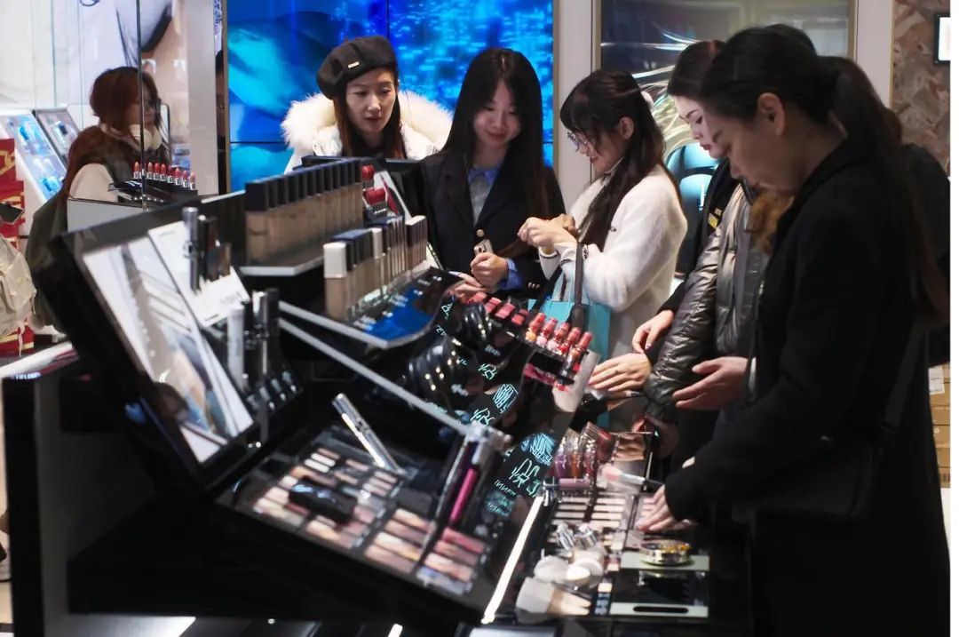 图为消费者在上海市南京东路步行街一家商场内选购化妆品
