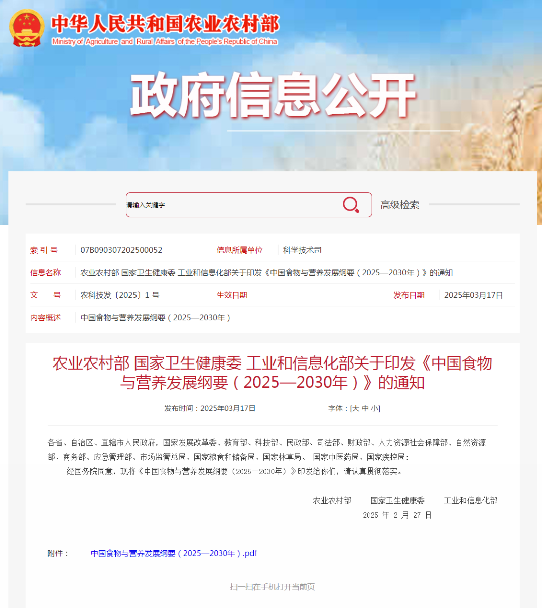 3月17日,由农业农村部、国家卫生健康委、工业和信息化部三部门联合印发的《中国食物与营养发展纲要(2025—2030年)》正式公布。