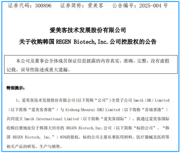 2025年3月10日,爱美客宣布拟通过全资子公司爱美客国际收购韩国REGEN Biotech Inc.(以下简称“REGEN”)85%股权,交易金额达1.90亿美元(约合14亿人民币),成为其上市以来首次跨境并购。