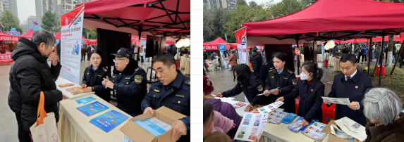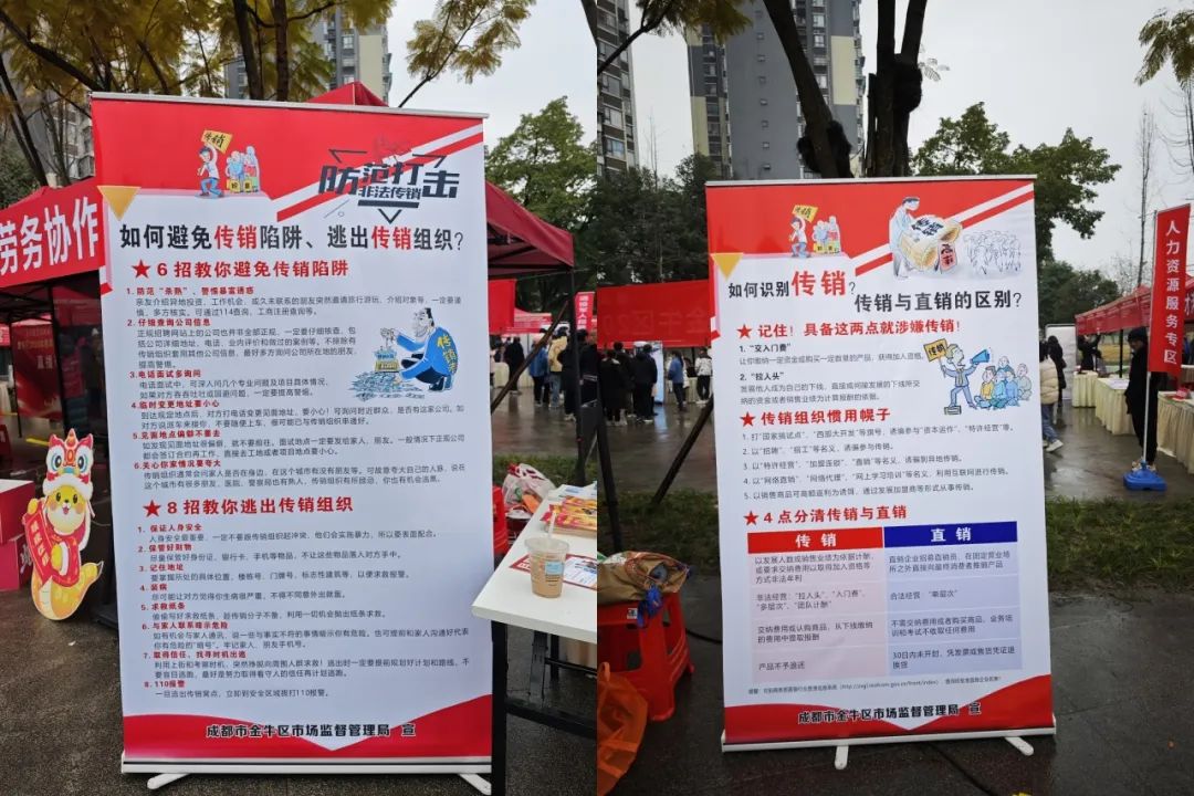 为提高广大求职者对传销的警惕性和认知度,维护劳动者合法权益,2025年2月20日,成都市金牛区市场监管局以“金牛区2025年春风行动专场招聘活动”为契机,联合成都市金牛区人民检察院、成都市公安局金牛区分局在金牛区天回镇天龙南三路万圣家园AB广场开展打击防范传销宣传活动。