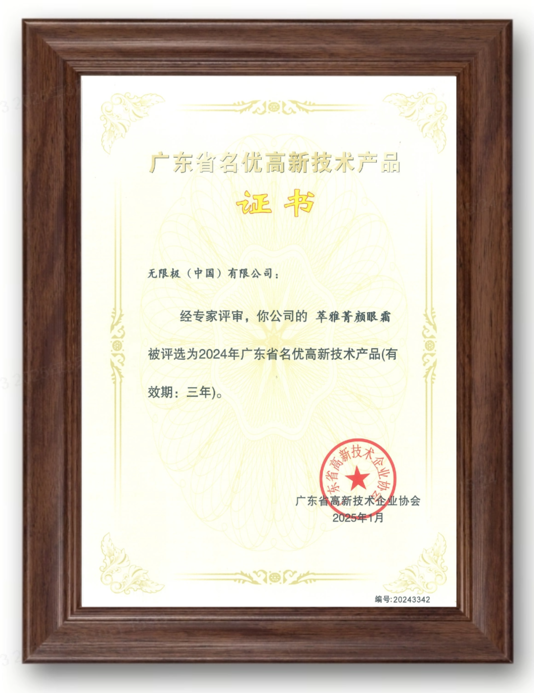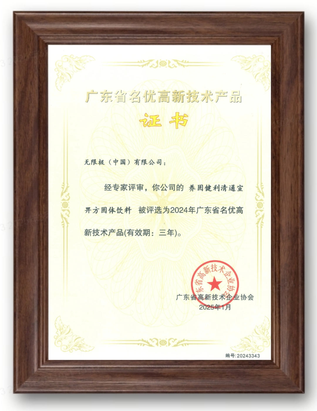 近日,广东省高新技术企业协会颁发了2024年广东省名优高新技术产品证书,无限极(中国)有限公司旗下三款产品——养固健利清通宣畀方固体饮料、萃雅菁颜眼霜、植雅防蛀护龈儿童牙膏获“2024年广东省名优高新技术产品”称号,体现了评审专家们对无限极研发实力和技术创新能力的充分认可。
