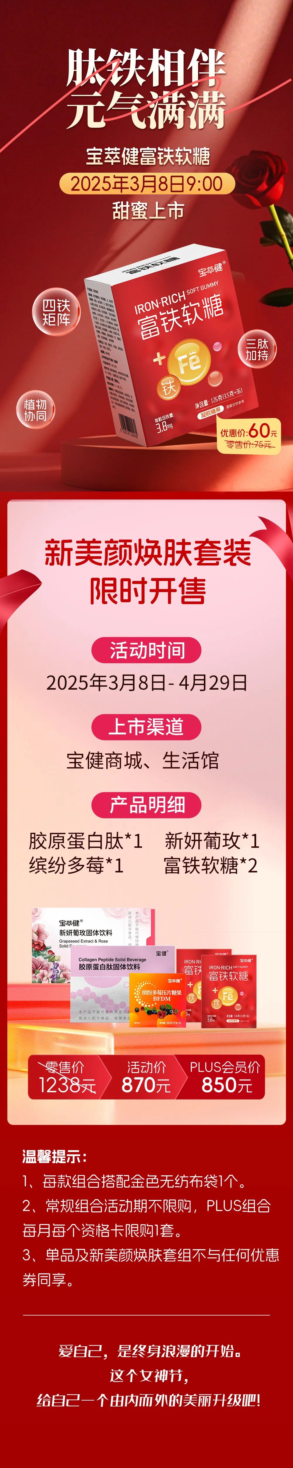 新美颜焕肤套装汇集胶原蛋白肽、新妍葡玫、缤纷多莓和富铁软糖四款健康产品,由内而外守护您的健康好气色。