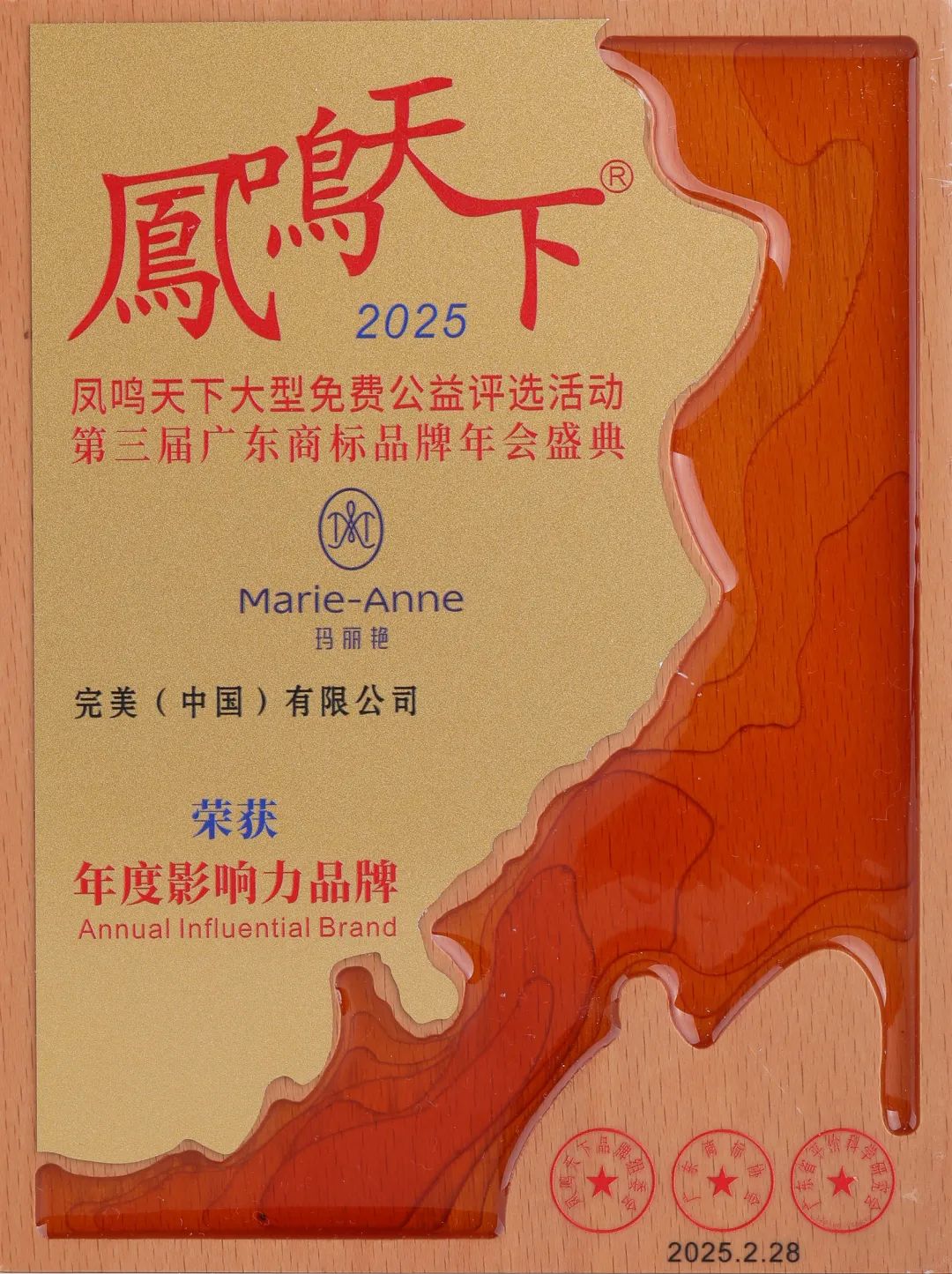 2月28日,由凤鸣天下品牌组委会、广东商标协会、广东省评价科学研究会联合主办的“2025年凤鸣天下商标品牌盛典”在白云国际会议中心隆重举行。完美公司成为唯一斩获凤鸣天下三大荣誉的企业,喜获社会责任杰出贡献奖;玛丽艳商标荣获年度影响力品牌奖;完美公司CEO彭志红被评为“凤鸣天下品牌企业杰出人物”。