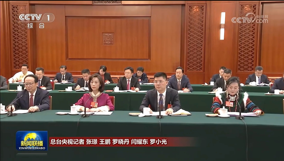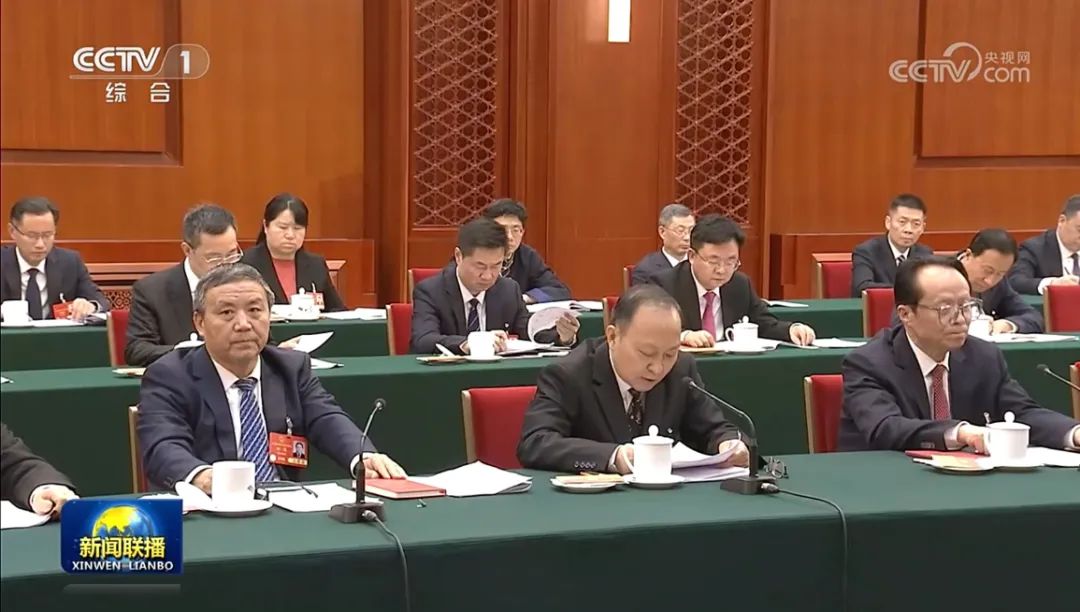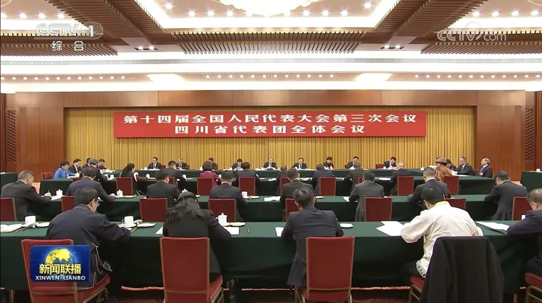 央视《新闻联播》|耿福能代表(左1)参加第十四届全国人民代表大会第三次会议四川代表团全体会议。