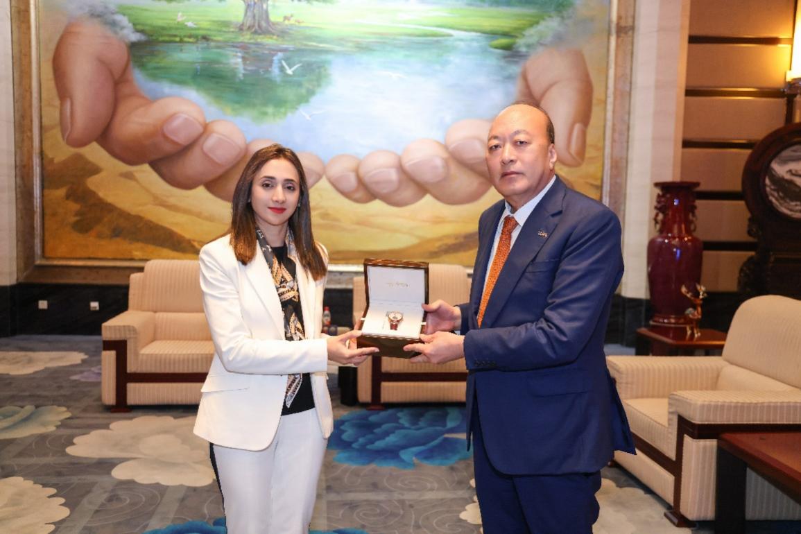 巴基斯坦参议院主席资深战略顾问、参议院外交与政治事务秘书长米斯巴·卡哈尔(Misbah Khar)女士与天狮集团董事局主席李金元先生互赠礼物