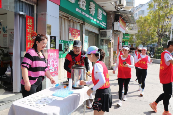 途中,跑团队伍有序而行。前行之中,不时传来阵阵欢笑声。而每到一处门店,跑团都会得到茶水补给,并在此合影打卡。