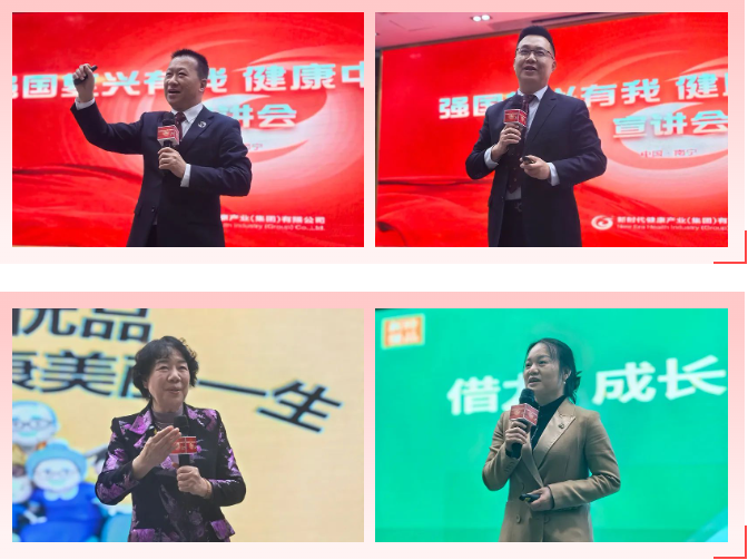 优秀新时优品健康管理服务中心负责人韦之煌、浦涛、蒙振娟、陈玉红围绕着大健康行业发展的趋势、企业的价值远景、新时优品升级、科学的新时代健康管理及如何有效进行市场破局等方面进行了分享。他们鼓励大家紧跟时代发展趋势,把握发展机遇,以优异的成绩为公司三十周年献礼。