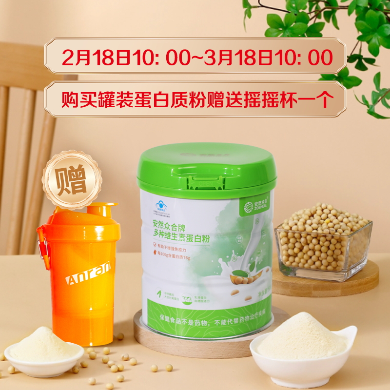 安然众合牌多种维生素蛋白粉不仅含有大豆分离蛋白 + 乳清蛋白两大优质蛋白,同时还兼备了多种维生素,每天两勺,轻松满足每日蛋白质摄入量。