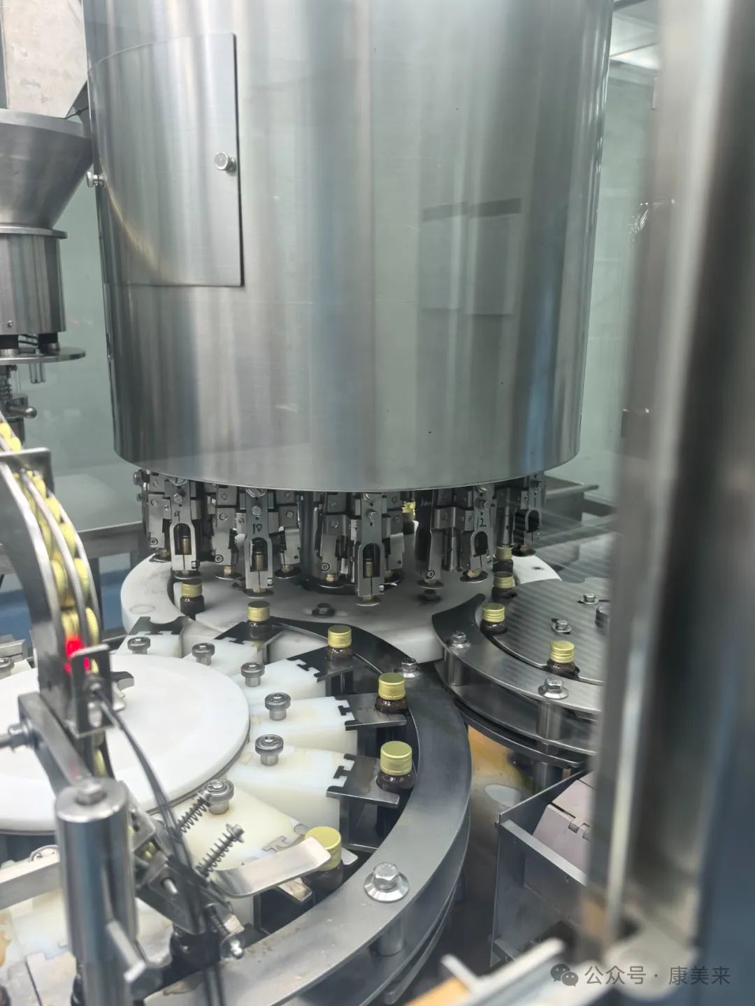 云湶谷牌铁皮石斛西洋参饮品正在生产线灌装,将口服液自动灌入玻璃瓶,自动拧盖,每小时可灌装9000瓶。