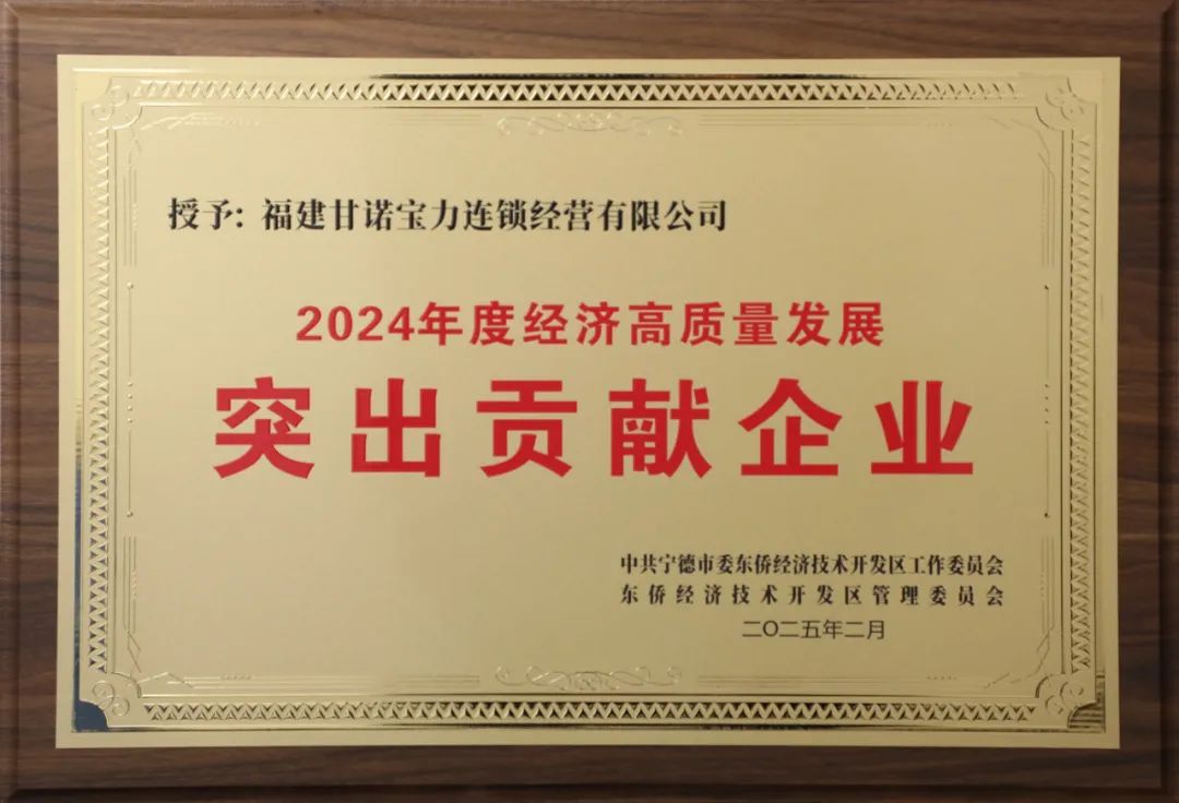 福建甘诺宝力连锁经营有限公司获评“东侨开发区2024年度经济高质量发展突出贡献企业”,高丽总经理(左一)作为公司代表领奖