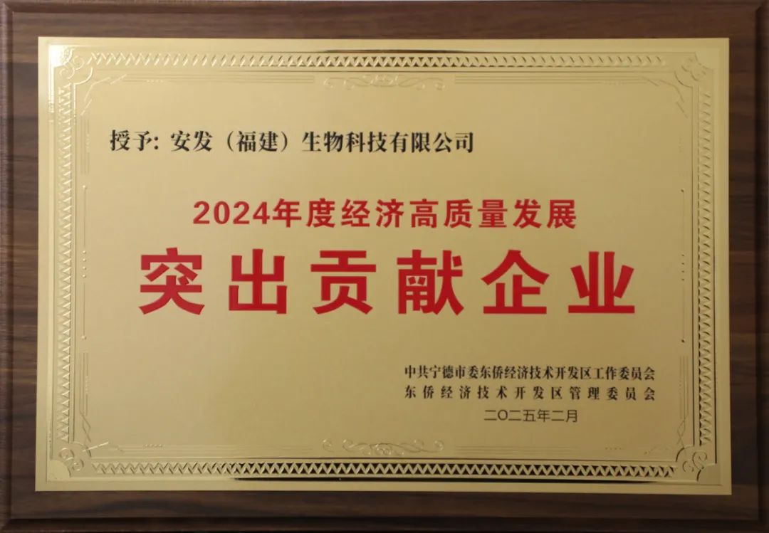 安发(福建)生物科技有限公司获评“东侨开发区2024年度经济高质量发展突出贡献企业”,郑春源总助(右二)作为公司代表领奖