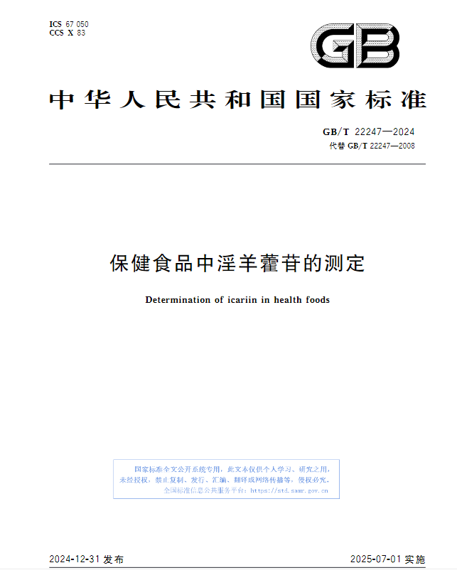 近日,国家市场监督管理总局、国家标准化管理委员会发布2024年第32号公告,批准发布了243项推荐性国家标准。其中《保健食品中淫羊藿苷的测定》(GB/T 22247-2024)标准将于2025年7月1日起正式实施。