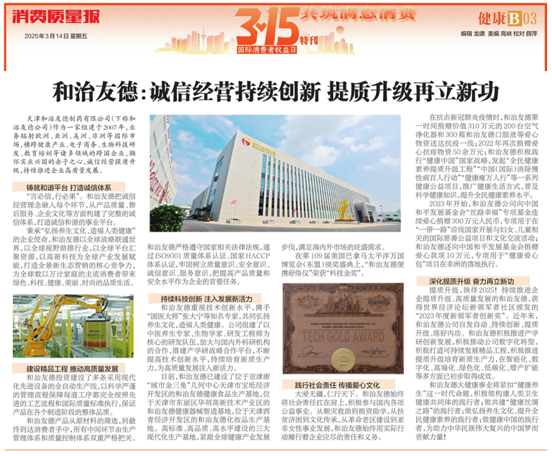 2025国际消费者权益日来临之际,《消费质量报》发刊《共筑满意消费3•15特刊》,以《和治友德:诚信经营持续创新 提质升级再立新功》为题对和治友德公司进行专刊报道。