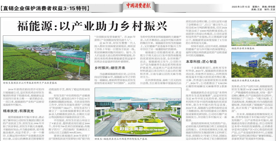 3月15日,中国消费者报推出了《2025年直销企业保护消费者权益3·15特刊》,其中以《福能源:以产业助力乡村振兴》为题,特刊对福能源进行了专题报道。