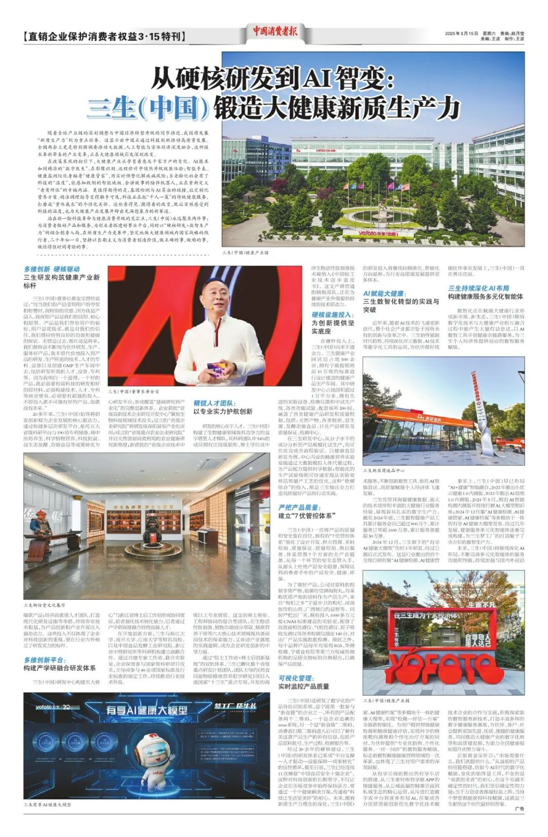 3月15日,中国消费者报推出了《2025年直销企业保护消费者权益3·15特刊》,其中以《从硬核研发到AI智变:三生(中国)锻造大健康新质生产力》为题,特刊对三生(中国)进行了整版的专题报道。